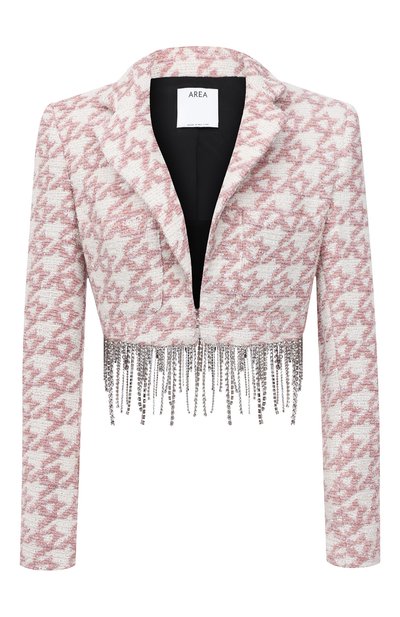 В коллекции сезона осень-зима команда марки представила свою версию жакета. Классический вариант с широкими лацканами укоротили, а низ подчеркнули каскадом из узких цепочек, инкрустированных миниатюрными прозрачными кристаллами. Для пошива изделия использовали плотный твид, где переплетением светло-розовых нитей с белыми образовали крупный узор гусиная лапка. Выразительнее рисунок получился за счет вкрапления люрекса.