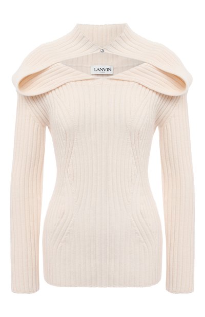 Белый пуловер из осенне-зимней коллекции бренда, основанного Жанной Ланван, не выглядит просто. За правильное настроение отвечает драпированная вставка, создающая эффект пелерины. Модель выполнили фактурной вязкой из тонкой мягкой шерсти, которая не растягивается и не пилингуется.