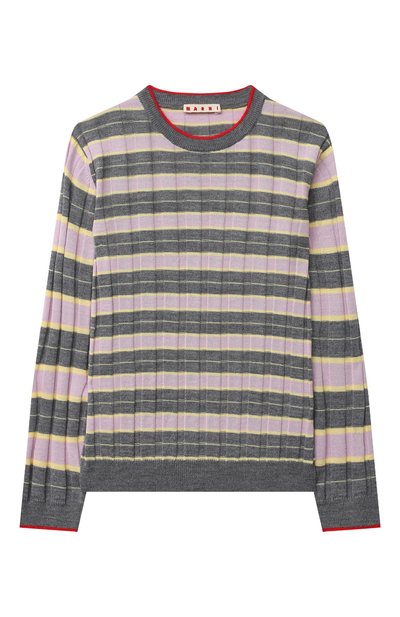 Мастера марки выполнили серый полосатый пуловер фактурной вязкой из тонкой мягкой пряжи. Шерсть в ее составе отвечает за поддержание оптимальной температуры, а благодаря легким прочным волокнам акрила модель не растягивается, не пилингуется и долго сохраняет изначальный вид.