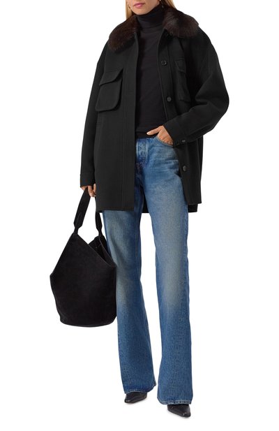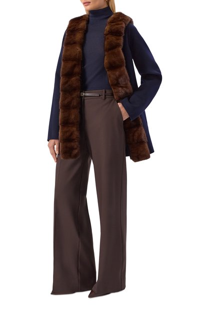 Синее пальто из осенне-зимней коллекции — прямое доказательство того, что оставаться модной можно и в русские морозы. Для производства изделия использовали тонкий мягкий кашемир, который в восемь раз теплее обычной шерсти и гораздо прочнее ее. А усилить эти свойства помогла подкладка из шелковистого норкового меха. Он не теряет густоту со временем, поэтому вещь надолго сохранит безупречный вид.
