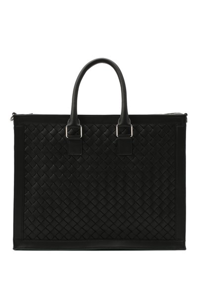 Черный шопер с короткими ручками и съемным плечевым ремнем вошел в осенне-зимнюю коллекцию. Вместительная сумка с одним отделением, застегивающимся на молнию, выполнена из узких полос матовой гладкой кожи в старинной технике плетения intrecciato. В комплекте — плоский футляр для документов.