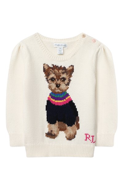 При создании пуловера молочного оттенка с особым вниманием отнеслись к выбору материала. Мягкая хлопковая пряжа с волокнами шерсти достаточно теплая и гладкая, вещь из нее не будет натирать нежную кожу ребенка. Изделие украсили красочным вывязанным узором в виде йоркширского терьера, одетого в свитер марки. Благодаря пуговицам на плече модель удобно надевать и снимать.