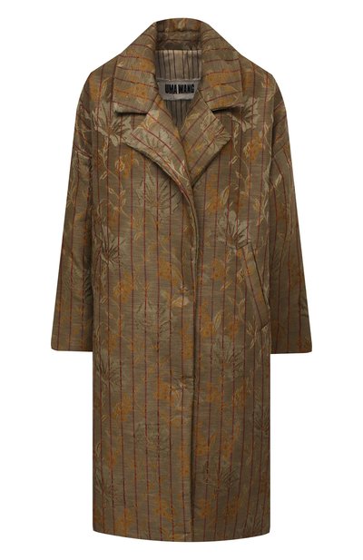 В сезоне осень-зима Ума Ванг интерпретировала классическое пальто по-своему. Бежевой двубортной модели со спущенной линией плеч дизайнер добавила объем, как у пуховика. Для пошива изделия с широкими лацканами использовали плотный фактурный жаккард с цветочным узором, подчеркнутым бордовой тонкой полоской и нитями приглушенно мерцающего люрекса.