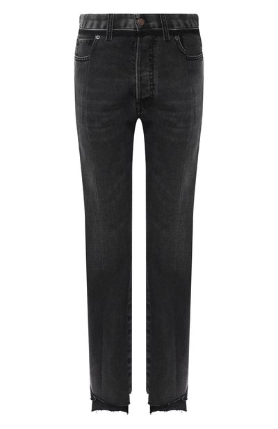 Черные укороченные джинсы из коллекции сезона осень-зима выполнили в технике Spliced. Сзади модель выглядит так, словно ее перекроили из двух разных вещей и отрезы намеренно не подгоняли по длине. Так низ и пятна, имитирующие карманы, получились асимметричными. Для пошива изделия использовали плотный хлопок с ненавязчивыми декоративными потертостями.