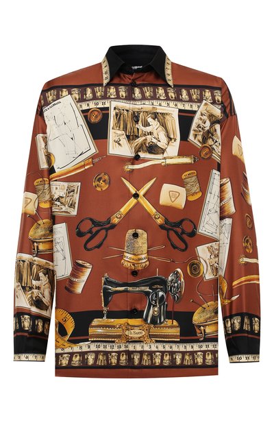 На создание осенне-зимней коллекции Доменико Дольче и Стефано Габбану вдохновили традиционные сицилийские ремесла. Например, эту коричневую рубашку с отложным воротником дизайнеры украсили разноцветным принтом, посвященным портновскому искусству. На показе модель из мягкого шелкового твила сочетали с водолазкой, свободными брюками и монками.