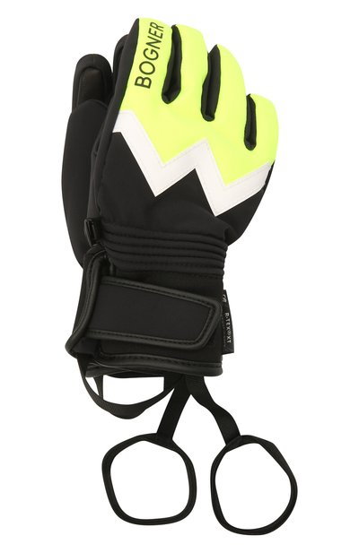 Черные перчатки из плотного водоотталкивающего материала и прочной кожи не боятся снега. За тепло отвечают мягкая флисовая подкладка и утеплитель PrimaLoft Gold, который не утяжеляет модель. Тыльную сторону аксессуара с широкими манжетами подчеркнули W-образной отделкой в двух цветах: белом и салатовом.