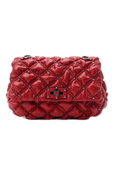 В сумке SpikeMe сделали ставку на оттенке hot red, который особенно эффектно выступает в тандеме с шипами-пирамидами с рутениевым покрытием. Этими фирменными деталями по традиции подчеркнули ромбовидный узор, получившийся на этот раз объемным. Когда мастера марки, основанной Валентино Гаравани, прошивали нежную кожу наппа, ее немного присобрали.