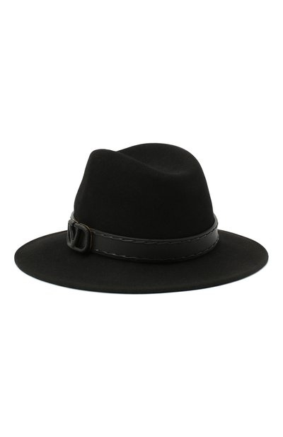 Черная федора из бархатистого кроличьего фетра задаст правильное настроение любому образу. Аксессуар с высокой тульей и полями средней ширины дополнен кожаной лентой с крупной фигурной пряжкой VLogo, оплетенной таким же материалом.