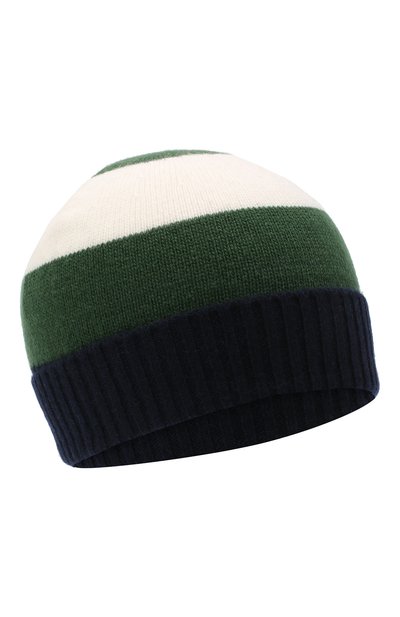 Облегающую шапку бини с широкими полосами белого и зеленого оттенков связали из мягкой шерстяной пряжи. Такой материал не колется и поддерживает оптимальную для головы температуру, поэтому в аксессуаре не будет холодно или жарко. Темно-синий отворот выполнили английской резинкой, поэтому он не дает изделию сползти и служит дополнительной защитой ушей от ветра.