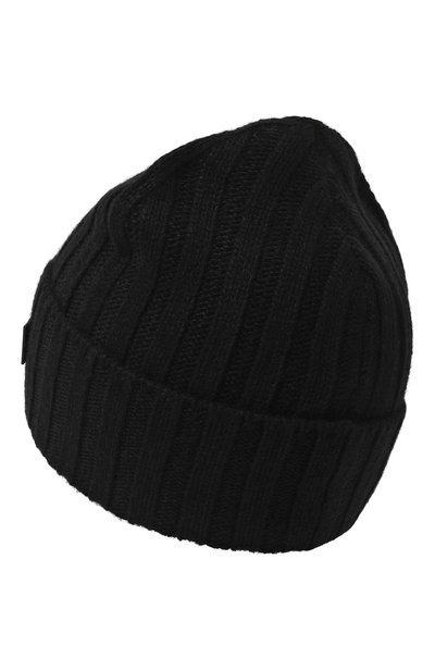 Черную однотонную шапку с широким отворотом выполнили английской резинкой. Такой аксессуар хорошо тянется и плотно облегает голову. Мастера марки связали модель из тонкой кашемировой пряжи, изготовленной из подшерстка монгольских коз. С каждого животного получают не более 300 грамм пуха, который тщательно сортируют, чтобы оставить только самые длинные и гладкие волокна.