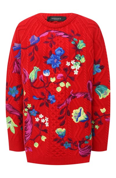 На показе осенне-зимней коллекции алый свитер с арановыми узорами сочетали с мини-юбкой и ботильонами на платформе, а мы предлагаем заменить обувь ботинками. Для изготовления модели использовали мягкую мериносовую шерсть, которая согревает лучше обычной. Донателла Версаче украсила вещь разноцветным мотивом Barocco Garden, вдохновленным гобеленами викторианской эпохи и популярным в то время движением Arts & Crafts.