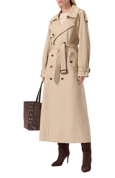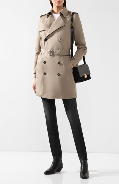 Под рукой Дэниела Ли традиционный тренч перестал выглядеть тривиально. Модель из межсезонной коллекции получилась графичнее: пряжке на поясе задали треугольную форму, отлетной кокетке — прямоугольную, а двойную разделили пополам и соединили детали так, что они напоминают о знаковом плетении intrecciato. Для большего эффекта скомбинировали прочную немнущуюся ткань теплого и холодного бежевого оттенка.