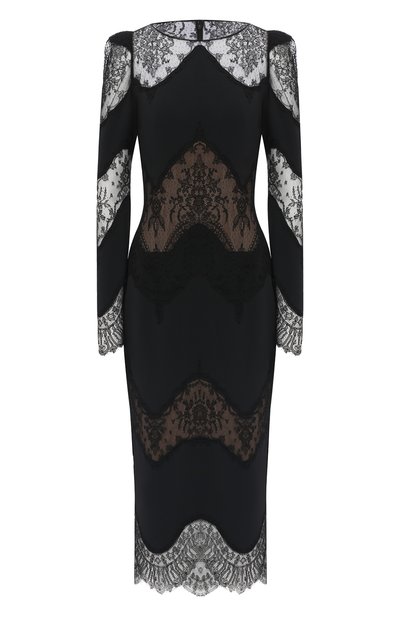 В случае с черным платьем из осенне-зимней коллекции Зухэир Мурад оставил крой максимально лаконичным, сделав ставку на контраст материалов. Облегающую модель сшили из плотного мягкого текстиля и тонкого ажурного кружева с цветочным орнаментом. Вещь дополнили подкладкой телесного оттенка таким образом, что декольте, спина и часть рукавов остались полупрозрачными.