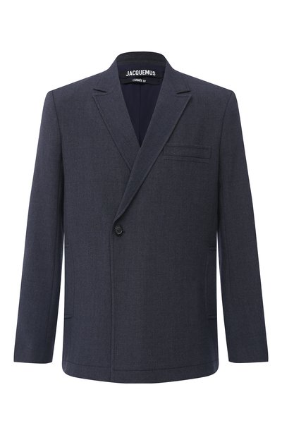 В пиджаке из осенне-зимней коллекции читаются черты классической модели: лаконичный прямой крой, нейтральный синий цвет и узкие лацканы. Но Симон Порт Жакмюс сумел сделать вещь расслабленнее за счет смещенной пуговицы и боковых карманов, позаимствованных у пальто. Изделие сшили плотной мелкофактурной ткани.