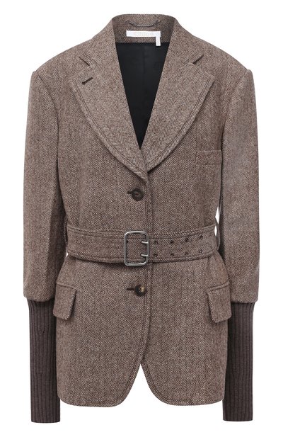 Пиджак оттенка молочного шоколада поможет правильно расставить акценты в casual-образе. Справиться с задачей модели из осенне-зимней коллекции помогает сложносочиненный крой: приталенное изделие словно надели поверх джемпера с длинными рукавами. Для пошива блейзера использовали комбинацию эластичного трикотажа и мягкой шерсти Virgin с мотивом herringbone.