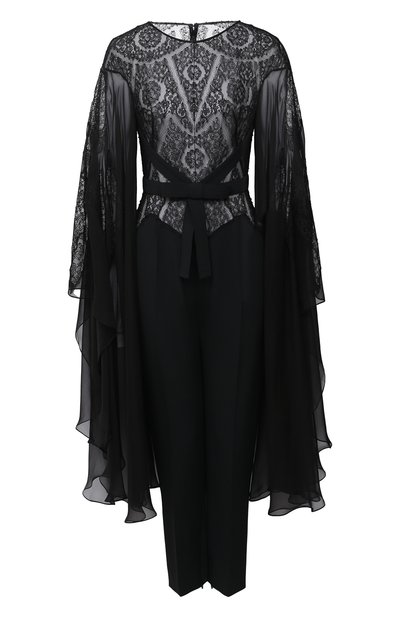 Комбинезон с кружевом может смотреться столь же роскошно, как и традиционное платье в пол. Зухэир Мурад доказал это на примере черной модели из осенне-зимней коллекции. Лиф одежды из шелковистой вискозной ткани сделали полупрозрачным, а рукава гипертрофированными и струящимися при движении. Такой же эффект создадут брючины, если расстегнуть снизу молнии. Внимание на талии акцентирует имитация пояса, завязанного бантом.