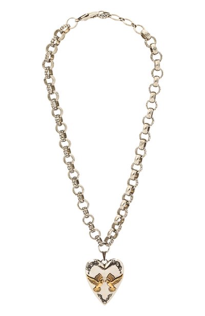 Серебристое колье больше напоминает старинное украшение. На это работает и эффект патины, подчеркивающей гравировку на цепочке, и объемный медальон, открыв который можно поместить внутрь фотографию. Деталь украсили фактурным изображением птиц: их часто рисовал в своем блокноте Александр Маккуин.