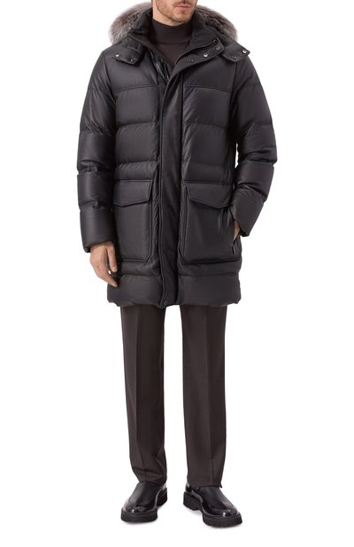 Пуховик вошел в капсульную коллекцию, разработанную с футболистом Юрием Джоркаеффом. Привычный для такой вещи нейлон заменили нежнейшей змеиной кожей. Ее бережно обработали, окрасили темно-синим пигментом и финально отшлифовали вручную: в результате ни один естественный узор не остался без внимания. Стеганое пальто утеплили отборными пухом и пером, поэтому в нем не будут страшны сильные морозы.