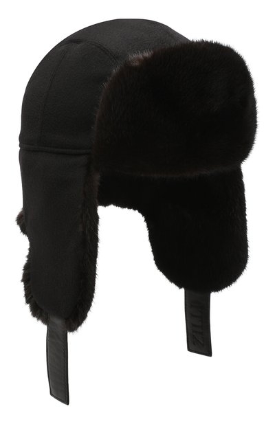 Черная шапка из меха норки безукоризненно рифмуется как с лаконичным пальто, так и с бомбером или пуховиком. Несмотря на объемный внешний вид аксессуар с тульей из плотного кашемира почти не ощущается на голове. Широкие наушники фиксируются под подбородком или вверху при помощи кожаных ремешков с застежками велькро.