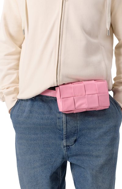 Поясную сумку Cassette оттенка Parakeet сплели в старинной технике intreccio из широких лент телячьей кожи. Аксессуар с ремнем, регулирующимся пряжкой в форме знакового треугольника, дополнили внутренним карманом.