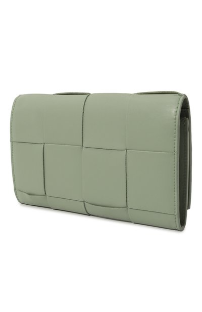 Серый кошелек выполнили из мягкой матовой кожи. Гладкой поверхности внутри противопоставлен узор снаружи: широкие полосы материала переплели в старинной технике intrecciato. Внутри предусмотрели два отделения для банкнот и двенадцать с лотов для пластиковых карт. Карман для монет, как и сам аксессуар, застегивается на молнию.