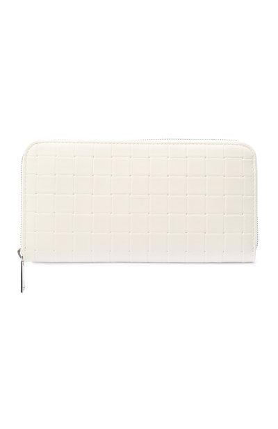 Молочно-белый кошелек из мягкой матовой кожи только кажется выполненным в технике intrecciato. Роль фирменного плетения безупречно играет кру пное тиснение, которое в точности повторяет характерный рисунок. Аксессуар с двумя отсеками для банкнот и разделительным карманом для монет дополнен восемью слотами для кредитных карт.