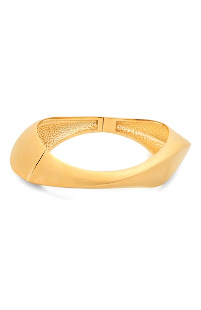 Крупный скульптурный браслет – смелое заявление для поклонниц минимализма. Такое украшение с матовой поверхностью сделает правильный акцент в спокойном наряде. Фигурный аксессуар изготовили из отполированного ювелирного сплава с золотым гальваническим покрытием.