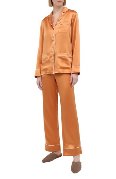Мастера марки сшили пижаму из гладкого плотного атласа, который почти не ощущается на теле и мягко скользит по коже. Деликатный блеск этой нежной на ощупь ткани делает многограннее насыщенный медный оттенок, придавая ему глубину. Рубашку с длинными рукавами и брюки с отворотами и регулируемым поясом-кулиской отделали по краям узким белоснежным кантом.