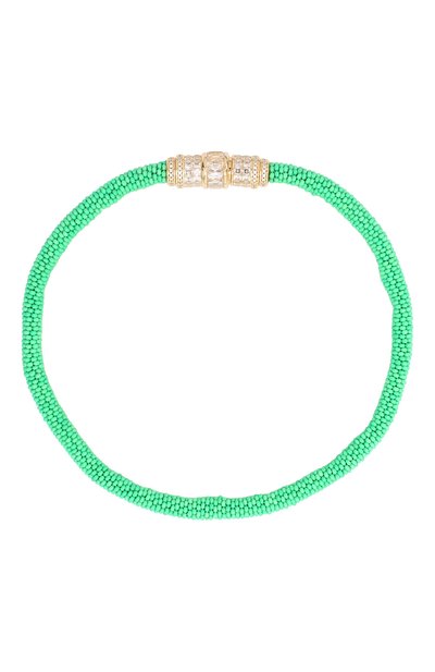 Зеленое колье одинаково удачно дополнит и повседневный, и нарядный образ. Аксессуар сплели из матового бисера. Главная деталь украшения — крупная застежка из серебра 925 пробы. Этот элемент украсили сверкающими кристаллами циркония.