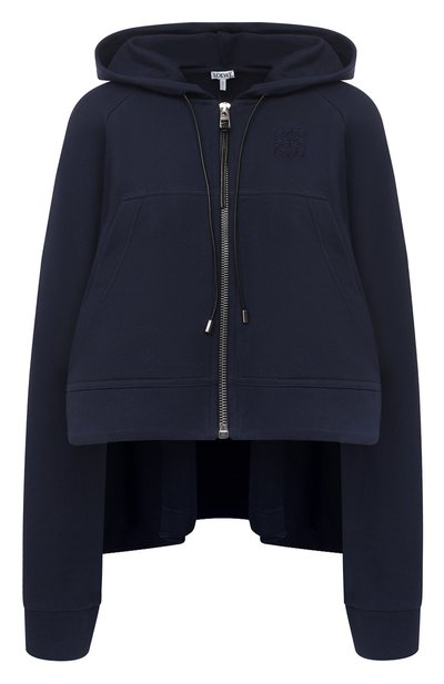 Темно-синяя толстовка из весенне-летней коллекции бренда, основанного Энрике Лоэве, не выглядит как модель в классическом прочтении. Джонатан Андерсон сделал вещь максимально расслабленной за счет свободного кроя и удлиненной спинки. Для пошива изделия использовали мягкий эластичной трикотаж, произведенный из легкого нежного хлопка.