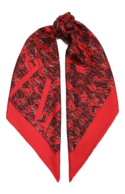 Платок с широким красным кантом виртуозно справляется с многозадачностью. Такой аксессуар можно оригинально обыграть, дополнив им хвост, повязав на ручку любимой сумки или продев в шлевки джинсов. Для производства изделия мастера марки использовали нежный шелковый твил, который почти не мнется. Паттерн в виде губ рифмуется с крупным логотипом бренда.