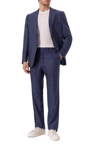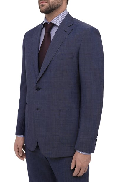 Костюм выполнили из фактурной ткани на основе шерсти и кашемира с добавлением шелка и льна. На пошив однобортного пиджака и прямых брюк ушло более 25 часов ручной работы. В комплекте – платок с фирменной алой точкой.