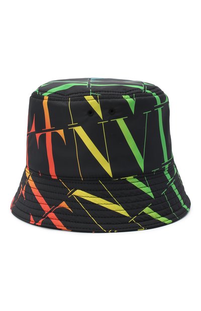 О принадлежности черной панамы бренду рассказывает архивная аббревиатура VLTN. Из нее составили паттерн, который нанесли в технике деграде: так неоновые оттенки плавно сменяются более сдержанными. Для пошива модели с широкими стегаными полями использовали гладкий плотный полиамид. Головной убор из такого материала хорошо держит четкость линий и обладает легким шелковистым блеском.