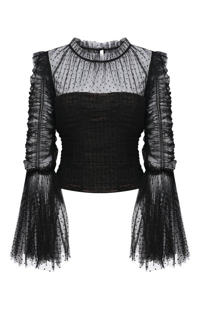 В черной блузе из коллекции сезона весна-лето гармонично все: и шелковистый полупрозрачный тюль пуэн-деспри, и мягкие драпировки, и плиссированные вставки на длинных рукавах. Если планируете создать полностью черный образ, то наши стилисты предлагают сыграть на контрасте фактур, дополнив такую вещь свободными брюками и лаковыми лоферами.