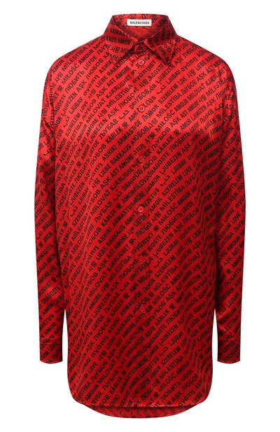 Демна Гвасалия украсил огненно-красную блузу из весенне-летней коллекции монохромным паттерном, составленным из слова «Любовь» на множестве разных языков. Для пошива свободной модели с отложным воротником дизайнер марки, основанной Кристобалем Баленсиагой, выбрал струящийся шелковый атлас с характерным блеском. Чтобы не перегружа ть образ, предлагаем носить такую вещь с брюками и туфлями черного цвета.