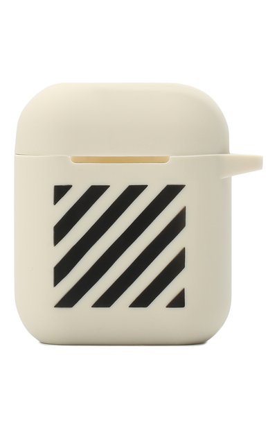 Компактный белый чехол для AirPods изготовили из прочного силикона, который не боится царапин. Благодаря открытому доступу к USB-порту футляр для наушников можно заряжать, не доставая его. Аксессуар со съемной текстильной ручкой-петлей украсили принтом в виде знаковых диагональных полос.