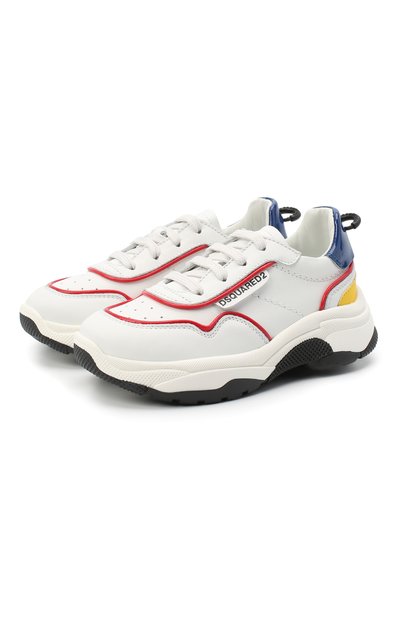 Для пошива белых кроссовок на широкой массивной подошве мастера марки использовали гладкую мягкую кожу. Фигурные детали подчеркнули узким красным кантом, а задник — разноцветными вставками. Благодаря небольшой петле сзади обувь удобно надевать и снимать.