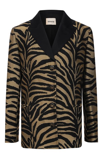 Золотистый пиджак из шелковистого вискозного твила с черным зебровым мотивом не останется незамеченным, но наши стилисты предлагают вывести wow-эффект на максимум, сочетая модель с парной мини-юбкой и кружевным топом. Блейзер из весенне-летней коллекции застегивается на брендированные пуговицы.