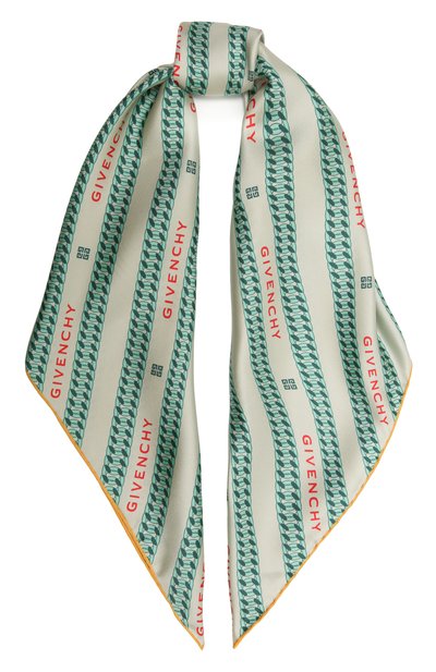 Мастера марки сшили платок из мягкого шелкового твила с легким матовым блеском. Благодаря характерному переплетению нитей такая легкая, приятная на ощупь ткани не оставляет заломов. В образе такой аксессуар станет универсальным солдатом, помогая оригинально обыграть и зону декольте, и прическу, и ремень сумки.