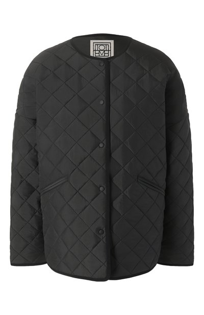 Стеганую куртку на синтетическом утеплителе выполнили из матового нейлона. Модель со спущенной линией плеч, фигурным низом, боковыми и внутренним карманами застегивается кнопками в тон.