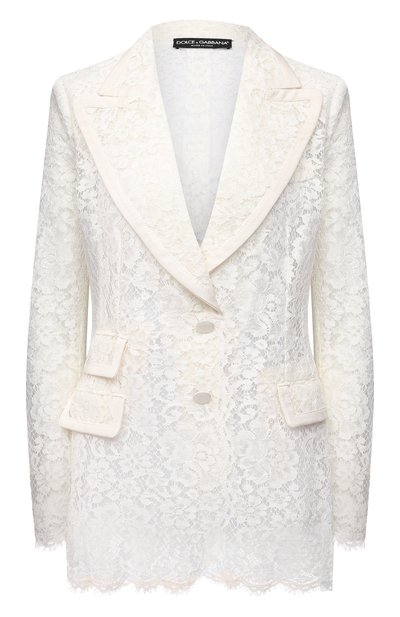 Доменико Дольче и Стефано Габбана включают однобортный жакет в каждую коллекцию марки, и сезон весна-лето 2021 года не стал исключением. На этот раз приталенную модель с широкими лацканами вывел на качественно новый уровень материал. Полупрозрачное кружево с нежным цветочным узором делает вещь романтичной, добавляя при этом долю провокации. Чтобы сохранить скульптурный крой без изменений, для подкладки выбрали тонкий, но прочный тюль.