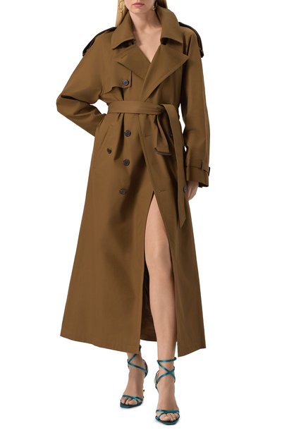 Тренч из весенне-летней коллекции 2021 года стал наглядной иллюстрацией интеллектуальной эстетики, присущей Эди Слиману. Сохранив в модели из мягкого прочного хлопка все характерные для классического фасона черты, дизайнер зашифровал в ней отсылку к историческому наследию марки. Так, паттерн на темно-коричневом фоне составлен из архивных логотипов, которые позаимствовали свою форму у цепей вокруг Триумфальной арки.