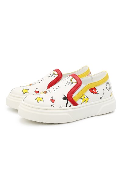Базовый белый цвет слипонов на широкой гибкой подошве, как у кедов, дизайнеры марки сделали удачным фоном для красочного принта, который словно нарисовали детской рукой. Насыщенные желтый и красный оттенки мотива повторили и в узком канте, подчеркивающем форму язычка и выреза. Для пошива пары использовали мягкую матовую кожу.