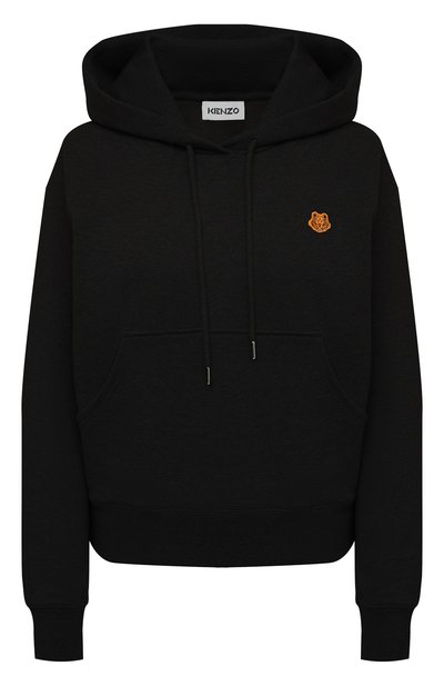 Черное худи из мягкого хлопкового трикотажа с махровой изнанкой — хорошее вложение в повседневный гардероб весенне-летнего сезона. Однотонная модель украшена спереди крупной узнаваемой вышивкой в виде головы тигра и логотипом марки, основанной Кензо Такада.