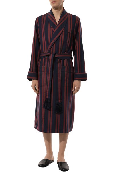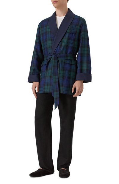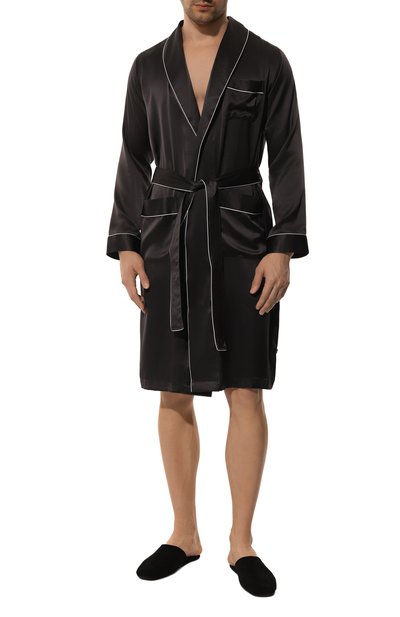 Халат с принтом Leaves выполнили из шелкового атласа. Модель с контрастным кантом по краям дополнили тремя накладными карманами, шалевым воротником и съемным поясом, регулирующим запах.