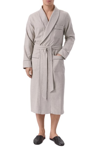 Сделать домашний отдых более комфортным поможет темно-серый халат с широким шалевым воротником. Модель с накладными карманами сшили из плотного шелкового атласа с благородным блеском. Из такого же белого материала выполнили узкий кант, подчеркивающий края деталей. В комплекте — пояс-лента, удерживающий запах.
