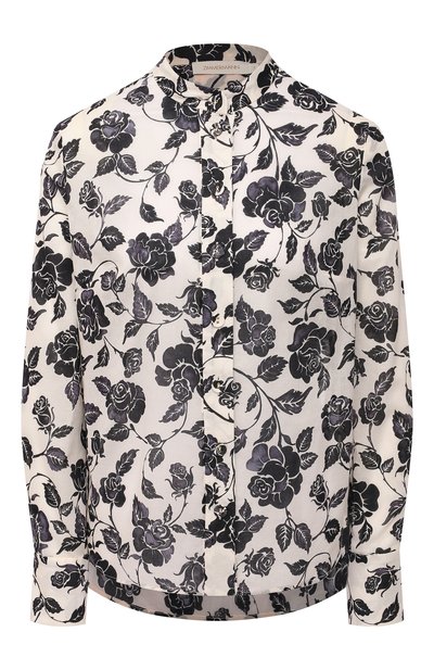 Белая рубашка из легкого хлопка напоминает художественное полотно, кропотливо проработанное чернилами. Визуального объема черного цветочного принта здесь добились полутонами. Из общей композиции не выбиваются даже пуговицы. Ники Циммерманн включила модель в круизную коллекцию. Эффектный повседневный образ с этой вещью п омогут создать шорты из такого же материала, а завершат комплект кремовые сабо.