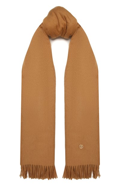 Длинный широкий шарф оттенка camel выполнили из переработанных кашемира и шерсти. Для этого материалы, которые ранее использовали для изготовления одежды и аксессуаров, разделили на волокна и тщательно рассортировали их по цветам (так получилось избежать процесса окрашивания и снизить расход воды и электричества). После их измельчили, спряли нити и соткали эту модель с бахромой по краям, а для дополнительной мягкости ее обработали ворсовальными шишками.