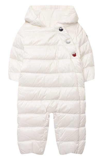 Белоснежный стеганый комбинезон сшили из фирменного легкого нейлона leger, который не пропускает влагу внутрь, быстро сохнет и не дает наполнителю выбиваться наружу. Модель с глубоким капюшоном и подкладкой из нежного дышащего джерси утеплили тонким слоем отборного гусиного пуха, поддерживающего оптимальную температуру. Изделие застегивается длинной молнией и крупными кнопками в виде эмблемы, покрытыми эмалью в цветах знакового триколора.