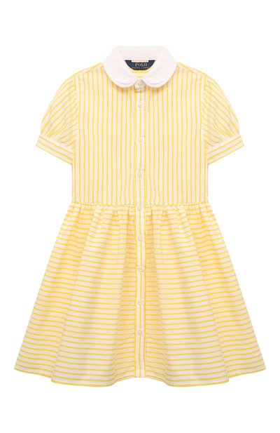 Платье-рубашка в яркую желтую полоску выручит в жаркий день. Для изготовления модели с расклешенным подолом мастера марки использовали тонкий хлопок. Благодаря пористым волокнам, которые пропускают воздух и отводят влагу, ткань будто охлаждает кожу. Изделие завершили белоснежным воротником питер пэн и вышивкой в виде игрока в конное поло.